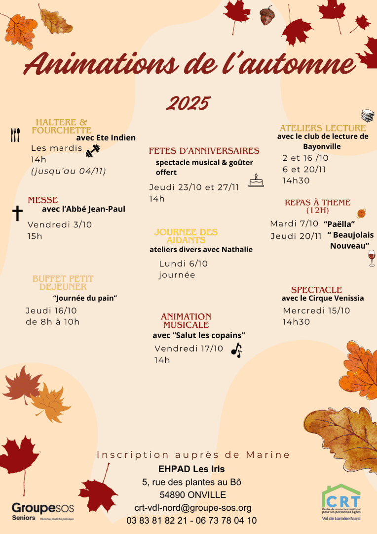Le Centre de Ressources Territorial du Val de Lorraine Nord a le plaisir de vous présenter le programme des animations automnales 2025, organisées à l'EHPAD Les Iris d'Onville.