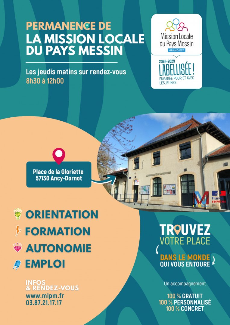 La Mission Locale du Pays Messin tient une permanence chaque jeudi matin, sur rendez-vous, de 8h30 à 12h00 à Ancy-Dornot, au sein de l'espace France Services (Place de la Gloriette).