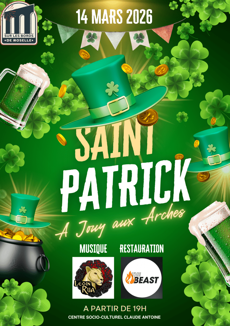 La Saint-Patrick s'invite à Jouy-aux-Arches le samedi 14 mars 2026 à partir de 19h, au Centre socio-culturel Claude Antoine.